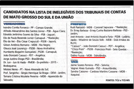 Entre os fichas-sujas estão, por exemplo, Daltro Fiuza (MDB) ex prefeito de Sidrolândia que tenta o pleito em 2020 novamente e Rudi Paetzold (MDB) atual prefeito de Coronel Sapucaia, que tenta permanecer no cargo no pleito deste ano.