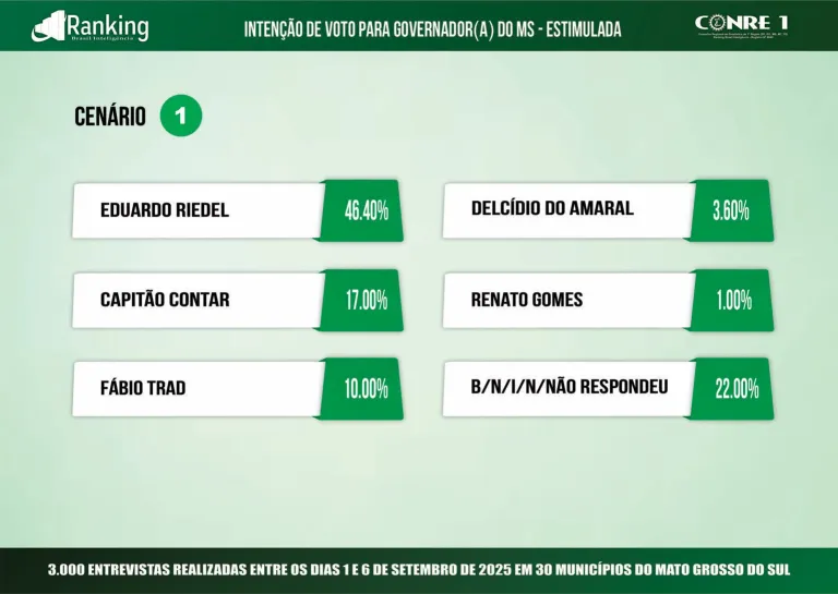Uma nova pesquisa de intenções de voto para o Governo de Mato Grosso do Sul, divulgada nesta terça-feira (9), mostra o governador Eduardo Riedel (PSDB) na liderança em diferentes cenários eleitorais. O levantamento foi realizado pelo Instituto Ranking Brasil Inteligência, que ouviu 3 mil eleitores entre os dias 1º e 6 de setembro em 30 municípios do estado.
