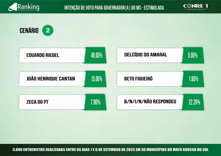 Já no segundo cenário testado, o governador amplia sua vantagem e chega a 49%, contra 15% de João Henrique Catan (PL), 7% de Zeca do PT, 5% de Delcídio e 1,8% de Beto Figueiró. Outros 22,2% afirmaram não saber ou não responderam.