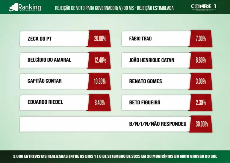 A pesquisa também avaliou a rejeição dos pré-candidatos. Zeca do PT aparece com maior índice, somando 20%, seguido de Delcídio do Amaral (12,4%), Capitão Contar (10,3%), Riedel (8,4%), Fábio Trad (7%), Catan (6,6%), Renato Gomes (3%) e Beto Figueiró (2,3%). Outros 30% não souberam ou não responderam.
