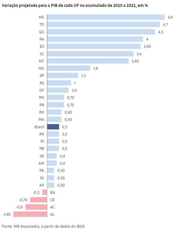 No acumulado de 2020 a 2022, 15 unidades da Federação —14 estados e o Distrito Federal— devem registrar variação superior à do PIB brasileiro, segundo a MB. Em relação a este ano, a maior alta prevista é para o Tocantins, de 1,7%, após projeções de recuo de 1,6% em 2020 e de avanço de 4,6% em 2021. Na sequência, aparecem Mato Grosso do Sul e Goiás. Em ambos os casos, o crescimento esperado em 2022 é de 1,4%. Já no acumulado, a maior alta deve ser de Mato Grosso do Sul (4,9%) seguido por Tocantins 4,7%)