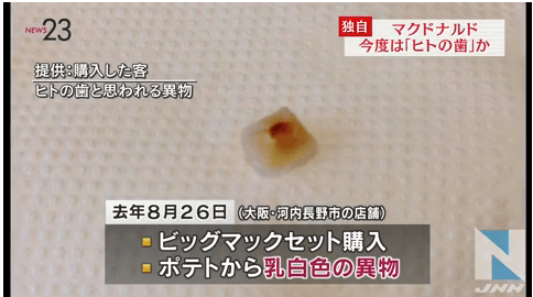 Em 2015, um cliente no Japão reclamou de ter encontrado um dente humano em meio a suas batatas fritas do McDonalds. Além desse caso, existem relatos semelhantes que aconteceram neste mesmo restaurante. O McDonalds veio a público no país se desculpar pelo ocorrido. No comunicado, a franquia de lanches também se desculpou pelo pedaço de plástico em um sorvete e por alguns pedaços de vinil encontrados em nuggets de frango, também no Japão.