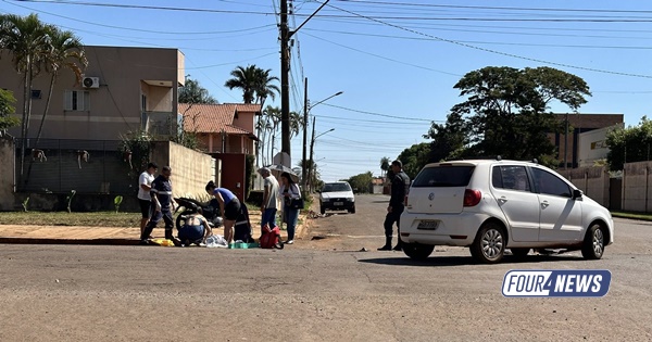 Um acidente entre uma motocicleta, pilotada por um entregador de aplicativo, e um carro chamou a atenção de quem passava pelo cruzamento da Rua Lúcia de Souza Melo com a Rua Rio Grande do Sul, em Sidrolândia, no final da manhã/tarde desta quarta-feira (23).