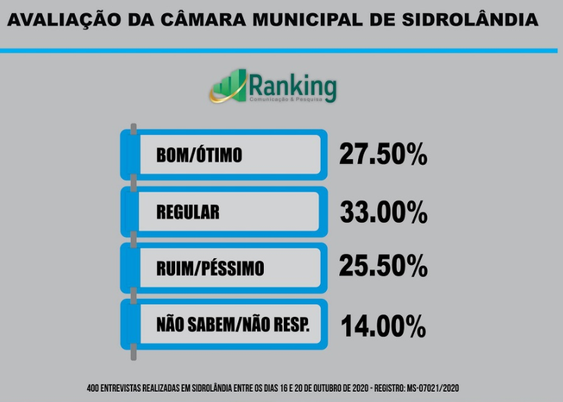 A gestão da Câmara Municipal de Sidrolândia segundo os sidrolandenses, deixa a desejar. Os dados foram divulgados ontem (22), pela pesquisa do Instituto Ranking que foi realizada com 400 pessoas entre os dias 16 e 20 de outubro. Do total, 33% avaliou como regular a gestão. 27.5% avaliou como bom/ótimo e 25.5% como ruim/péssimo.