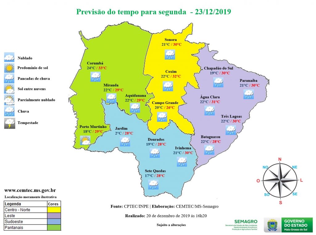 A semana no Natal começa com tempo instável em Mato Grosso do Sul. A previsão do Instituto Nacional de Meteorologia (Inmet) para esta segunda-feira (23.12) é de céu nublado a parcialmente nublado com pancadas de chuvas isoladas nas regiões norte e nordeste do Estado, onde pode haver chuvas fortes. Nas demais áreas, a previsão é de céu nublado a parcialmente nublado.