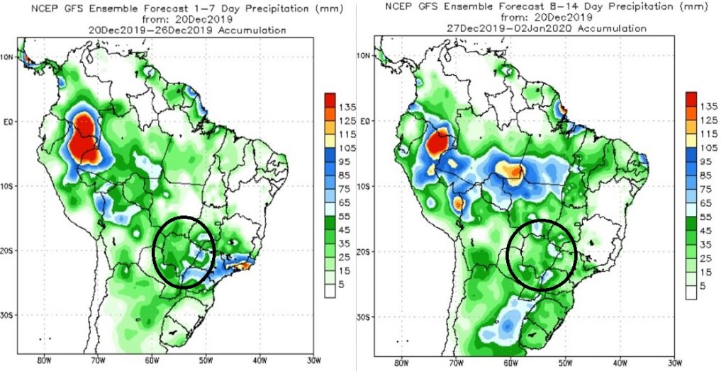 Já o período de 28 de dezembro a 5 de janeiro, será chuvoso em Mato Grosso do Sul. O modelo estima aumento significativo das chuvas, e são esperados até 125 milímetros acumulados. Os modelos de previsão numérica de tempo indicam que a virada do ano ano seja chuvoso em todas as regiões do estado. Nessas condições, faz-se necessário atenção as possíveis condições adversas no tempo que podem ocorrer, como chuvas intensas, ventos fortes e raios. Como os volumes esperados são altos, atenção a possíveis alagamentos, enxurradas e transtornos a população que possam eventualmente ocorrer nos municípios.