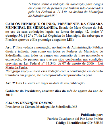 Foi publicado no ultimo dia 22 de Agosto no diário oficial da Câmara,a Lei Municipal de número 1.963 de 20 de Agosto de 2019 que impede a nomeação de pessoas que tenham sido condenadas pela Lei Maria da Penha .