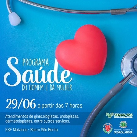 Prefeitura de Sidrolândia, Sindicato Rural e Senar/MS anunciaram nesta quinta-feira (27/06), o cronograma de serviços que serão oferecidos ao público durante o Programa Saúde do Homem e da Mulher, no sábado (29) das 8h às 14h no ESF Malvinas, localizado à Rua General Pinho, Bairro Malvinas.